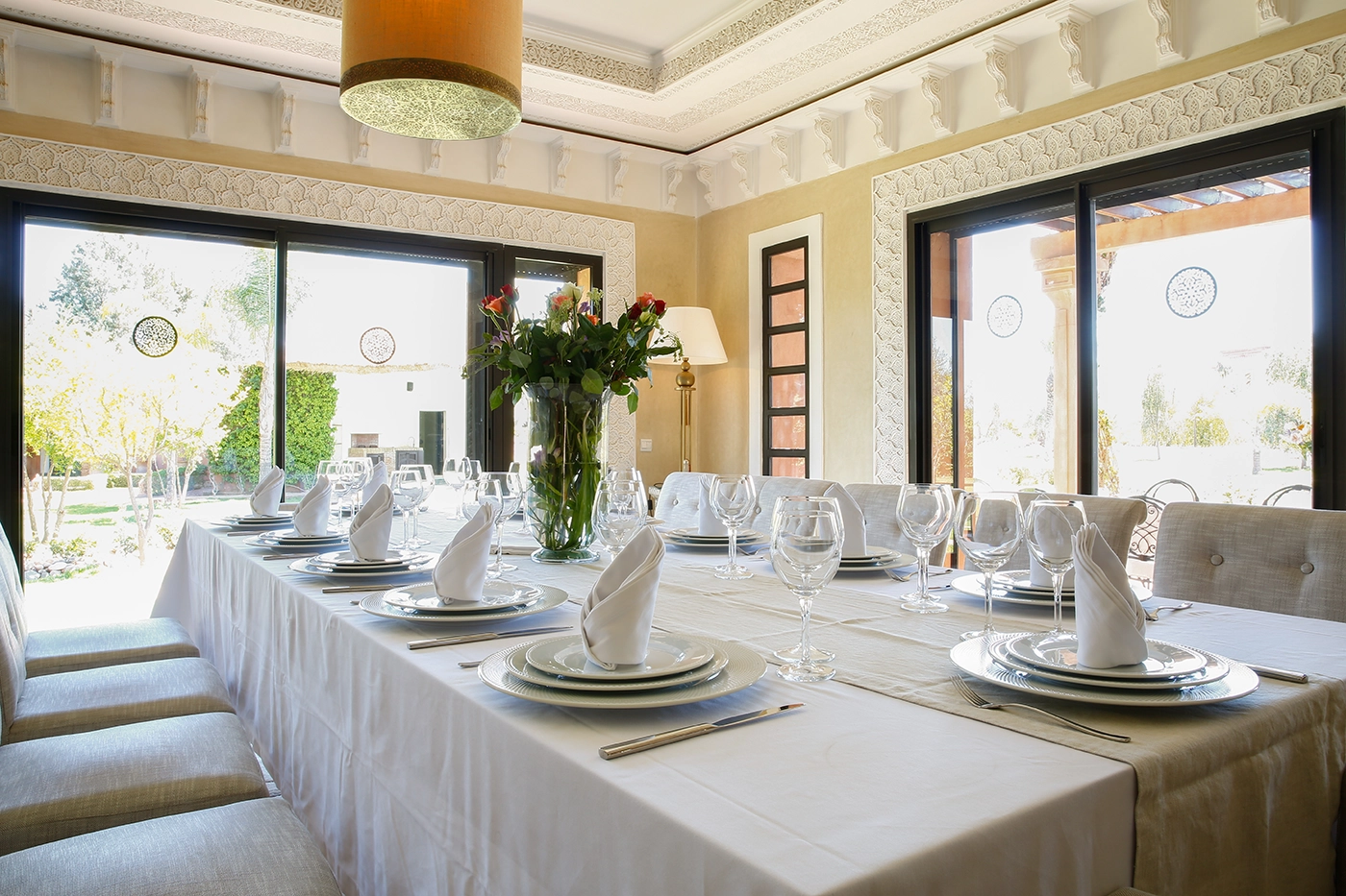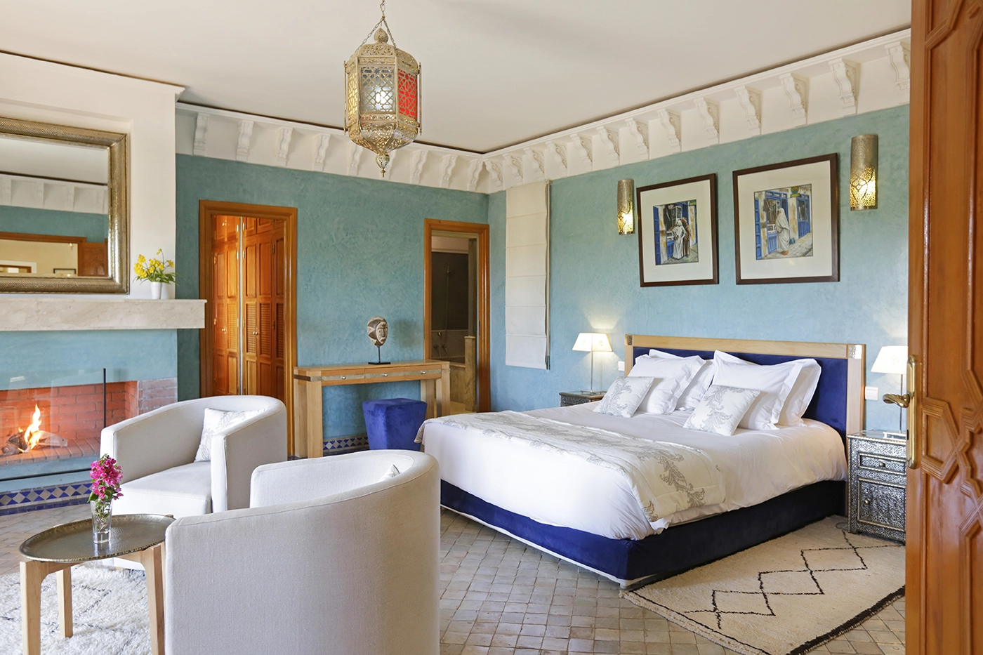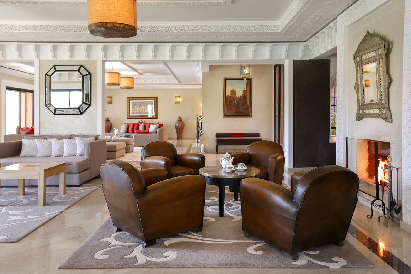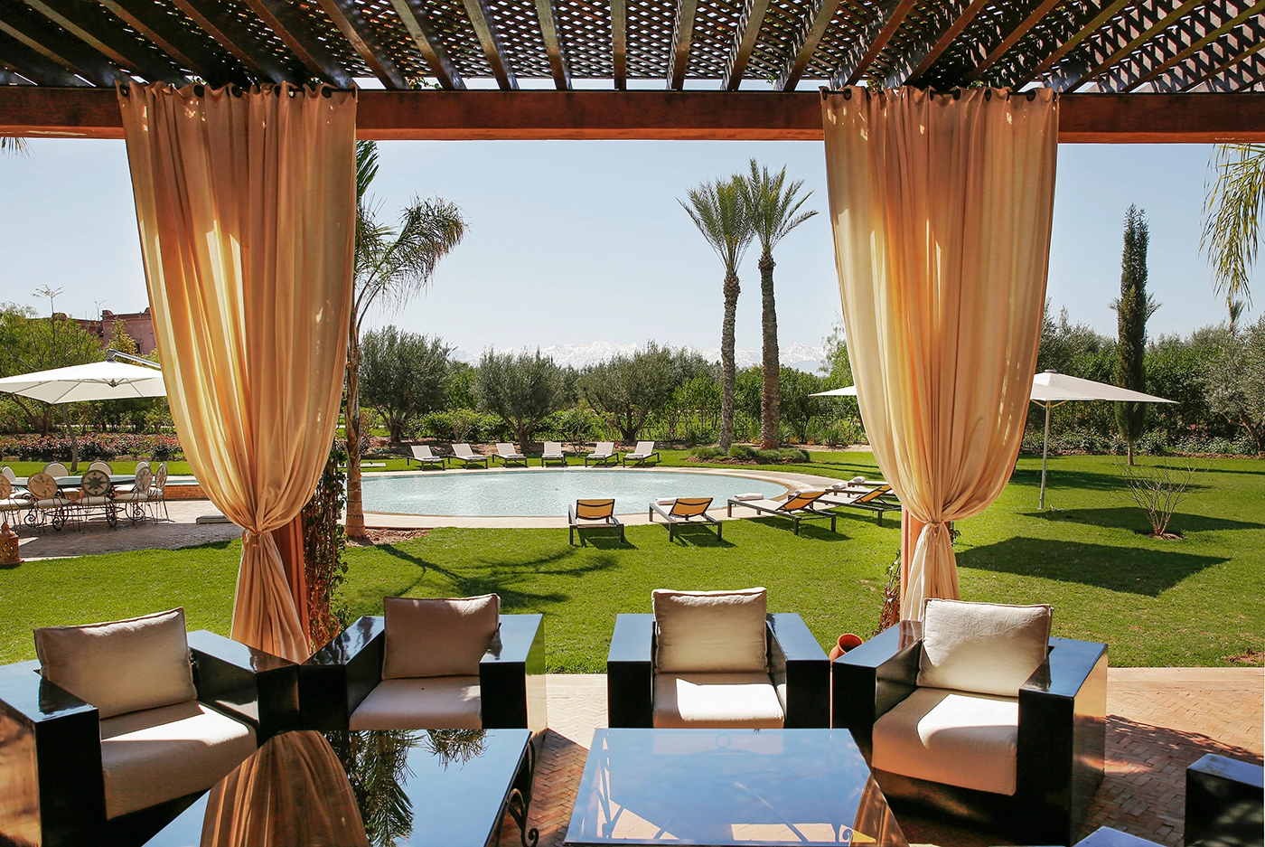 Take a break on the sun loungers, or settle by the aquatic bar of the pool house. For a break indoors, sink into the leather club chairs facing a wood chimney or the welcoming Moroccan living spaces of Villa Grace. Finish off the day, with a drink in hand, on the spacious terraces offering stunning views on infinite greenery and the Atlas peaks.The property also offers three stylish dining options; one indoor and two alfresco, overlooking the pool. In the same unwinding spirit, the property is able to offer a complete spa experience : sauna, hammam, jacuzzi, massage room.