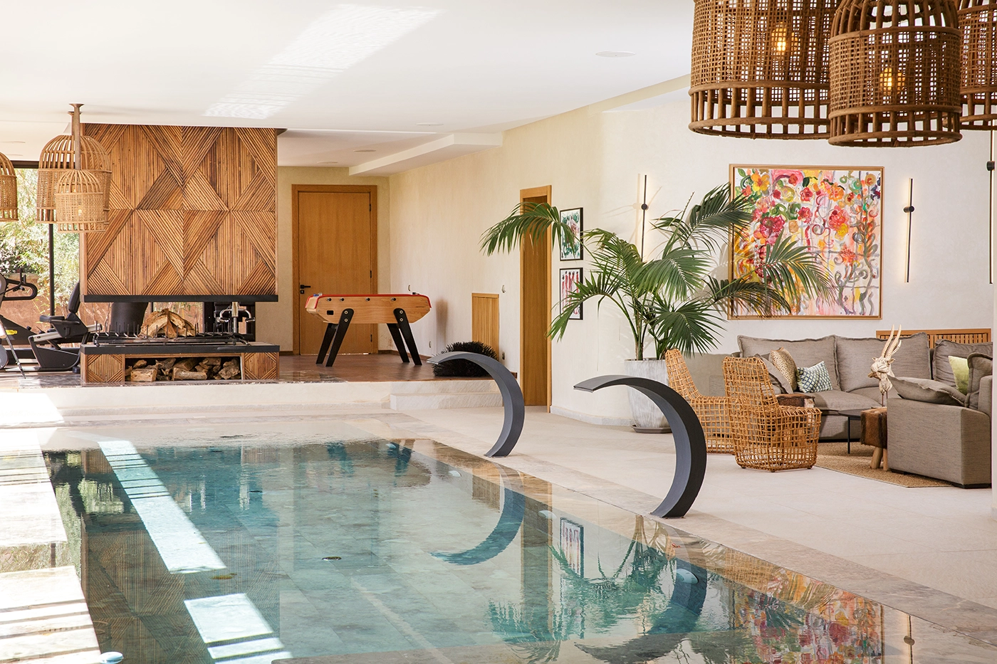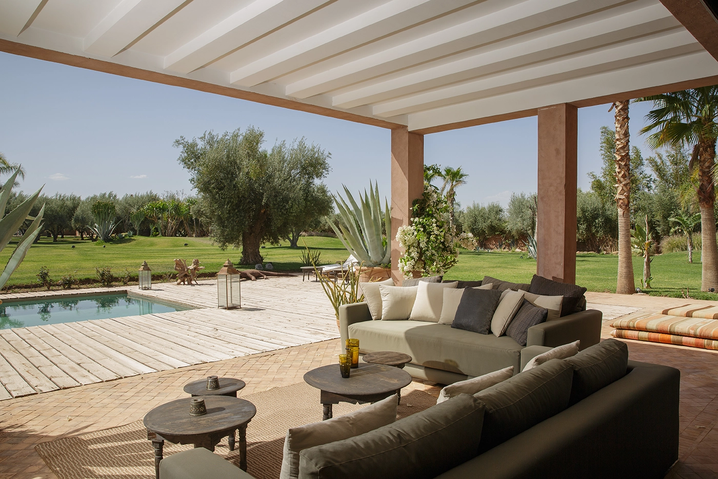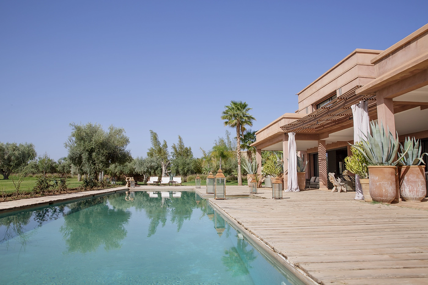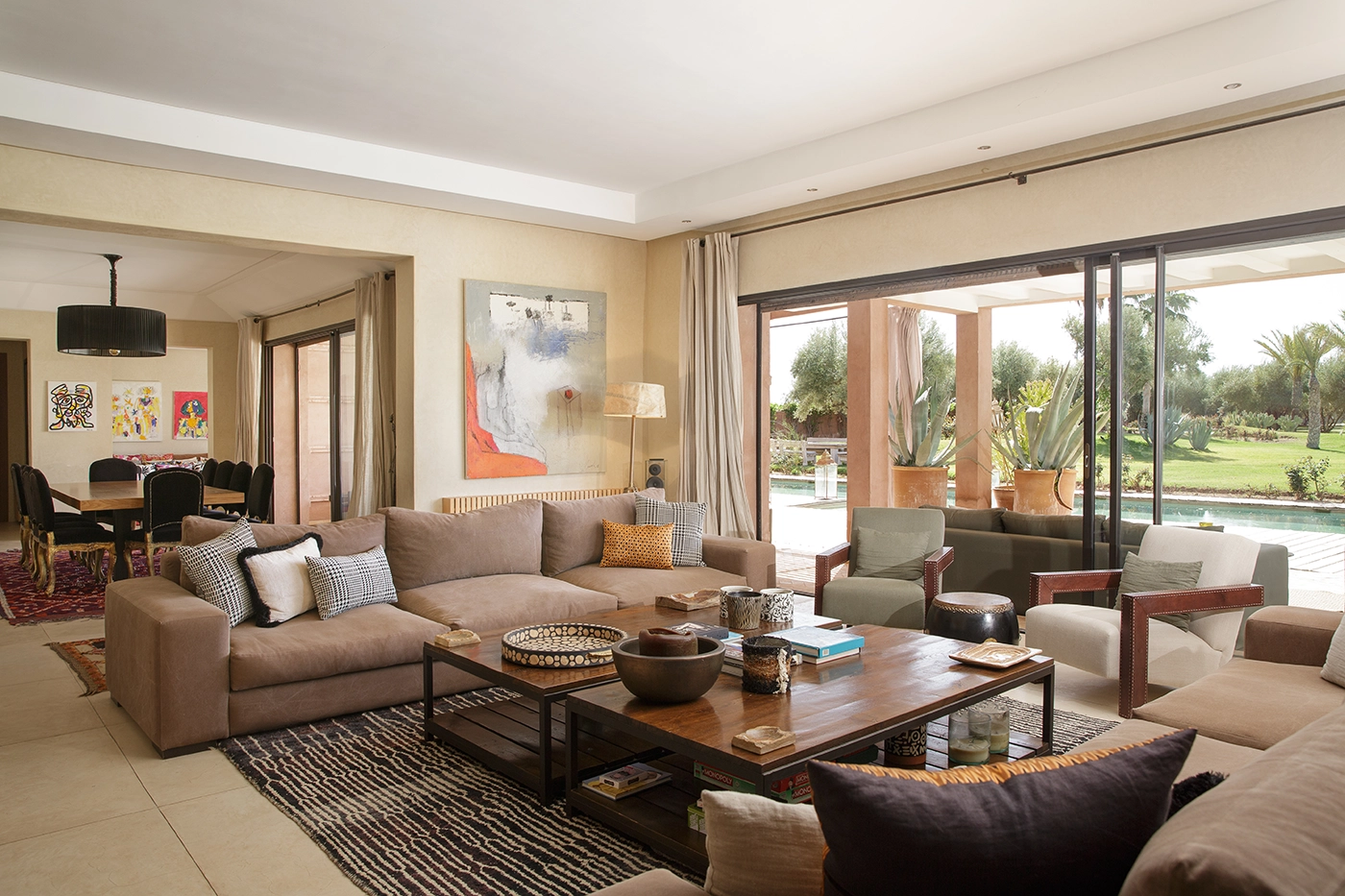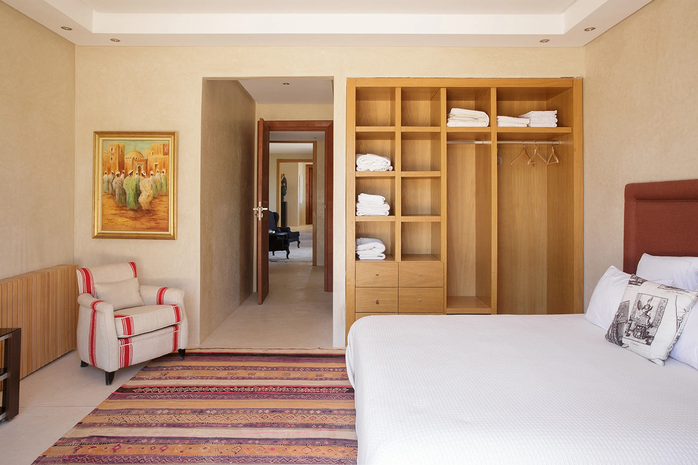 The villa’s traditional Moroccan design, with arches, tilework, and carved wooden doors, reflects the region’s rich culture. Inside, the villa combines Moroccan charm with modern comforts, featuring spacious living areas adorned with authentic artwork and plush furnishings.