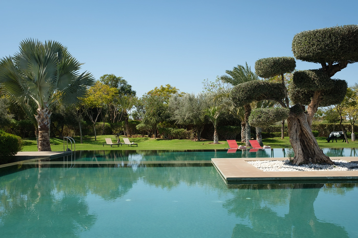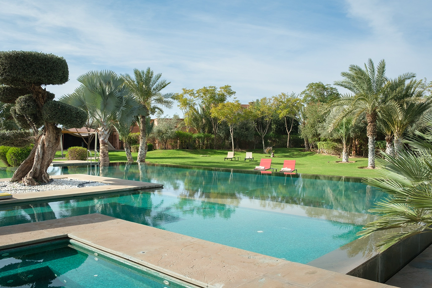 The sublime pool, a true gem of this haven, spans 20 x 20 meters, divided into four basins, including a functional jacuzzi heated year-round. Immerse yourself in luxury and relaxation, surrounded by an enchanting landscape.